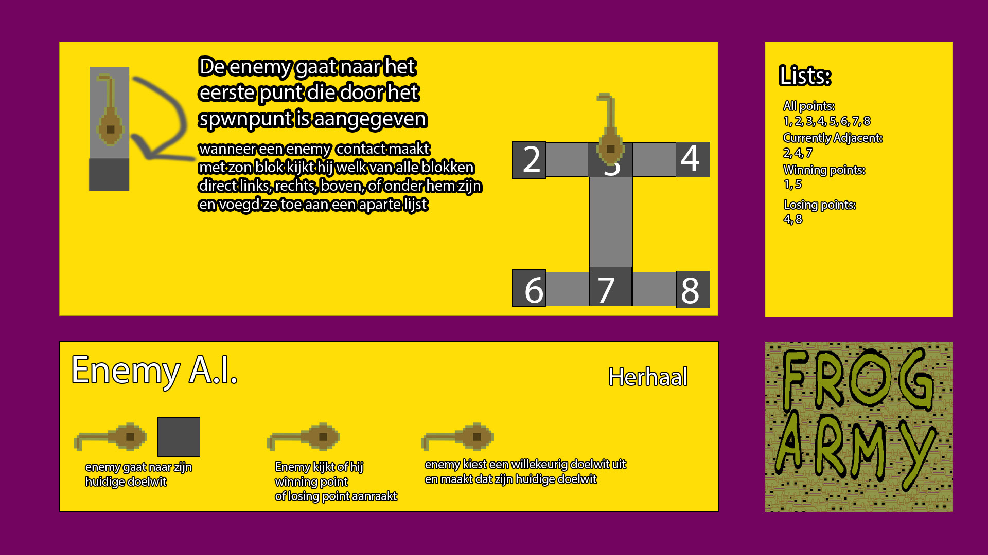 Frog tower defense was een opdracht die we moesten maken waar we individueel een tower defense game moesten maken. ik besloot een variatie toe te passen op de formule die ik nooit eerder heb gezien in een tower defense, in plaats van dat je wilt voorkomen dat de enemies naar het einde komen, wilde ik doen dat je wilt dat de enemies naar twee punten kunnen gaan, en het als speler het doel is om ze naar de goede uitgang te leiden. Ik vooral laten zien hoe de enemies bewegen, ik heb al uitgelegd hoe de gameplay werkt, en verder is het een best standaard tower defense game.