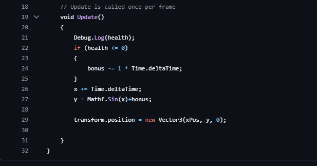 Hier is te zien dat ik de hoogte van de boss heb gedaan met een simpele sinusgolf, waardoor hij vlot maar rustig omhoog en omlaag blijft gaan. Het Bonus deel hieraan zorgt ervoor dat als de boss geen health meer heeft, hij zal zakken, waar hij zal verdwijnen en de speler wint.