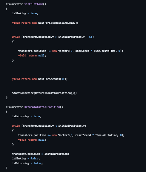 De platforms werken simpel, aan het begin nemen ze allemaal hun huidige y-positie op, daarna bewegen ze constant langzaam omhoog en omlaag, ook met een sinusgolf, wanneer ze geraakt worden door een vuurbal vallen ze totdat ze net offscreen zijn. Op dat punt begint er een timer op te tellen, wanneer deze timer 4 seconden aantikt komt het platform weer omhoog totdat hun y-positie hetzelfde is als de y-positie die ze aan het begin opnamen, en gaan ze weer in een staat waar de speler op ze kan staan, en ze weer geraakt kunnen worden door de boss.