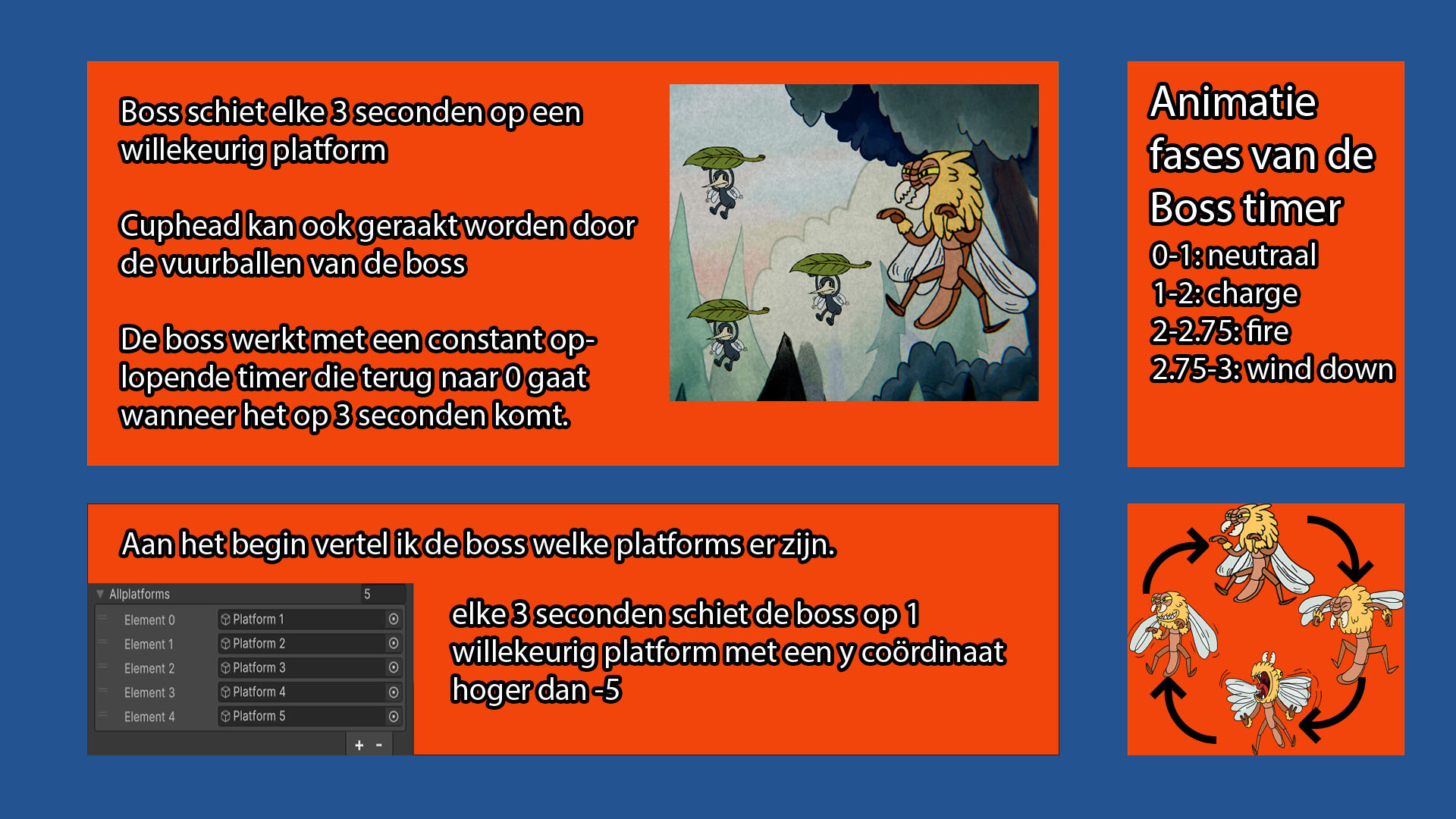 Voor de bossfight heb ik de ai gemaakt voor de boss, uitgebeeld hier in de visual sheet. Hieronder zal ik het hebben over hoe de platforms zelf werken maar voor nu kan ik wat code laten zien.
