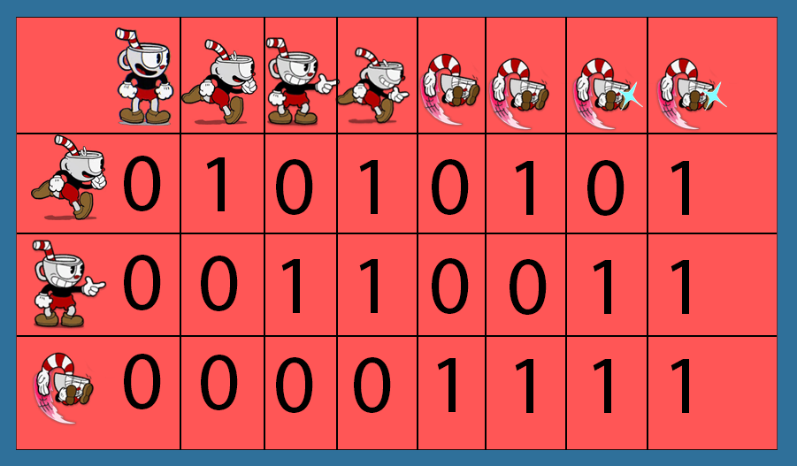 De animatie van cuphead gaf ons team wat problemen totdat ik met mijn oplossing kwam. Het probleem was dat cuphead een animatie heeft voor lopen, een animatie voor schieten, een animatie voor springen, en een animatie voor stil staan, alleen cuphead moet ook kunnen springen en schieten, of lopen en schieten, en die animaties overlapte vaak, de game kreeg tegelijkertijd te horen: "loop", "loop en schiet" en "schiet". Mijn oplossing die ik hierop gaf is dat we een binair systeem implementeren, de int die de animatie bestuurd begint op 0, wanneer cuphead stli staat, niet springt, en niet schiet. Die 3 acties zijn allemaal een bit in dit systeem. springen is 4, schieten is 2, lopen is 1. wanneer je begint te lopen wordt 1 toegevoegd aan de animatie int, zelfde met 2 op schieten en 4 op springen. dus stel cuphead springt en loopt, dan wordt 4 voor springen en 1 voor lopen toegevoegd aan de int. Vervolgens leest de animator dat de animatie int 5 is, en speelt het dus de animatie af voor lopen en springen. Als dit nogsteeds onduidelijk is heb ik hieronder een visual sheet gemaakt om het verder uit te leggen.