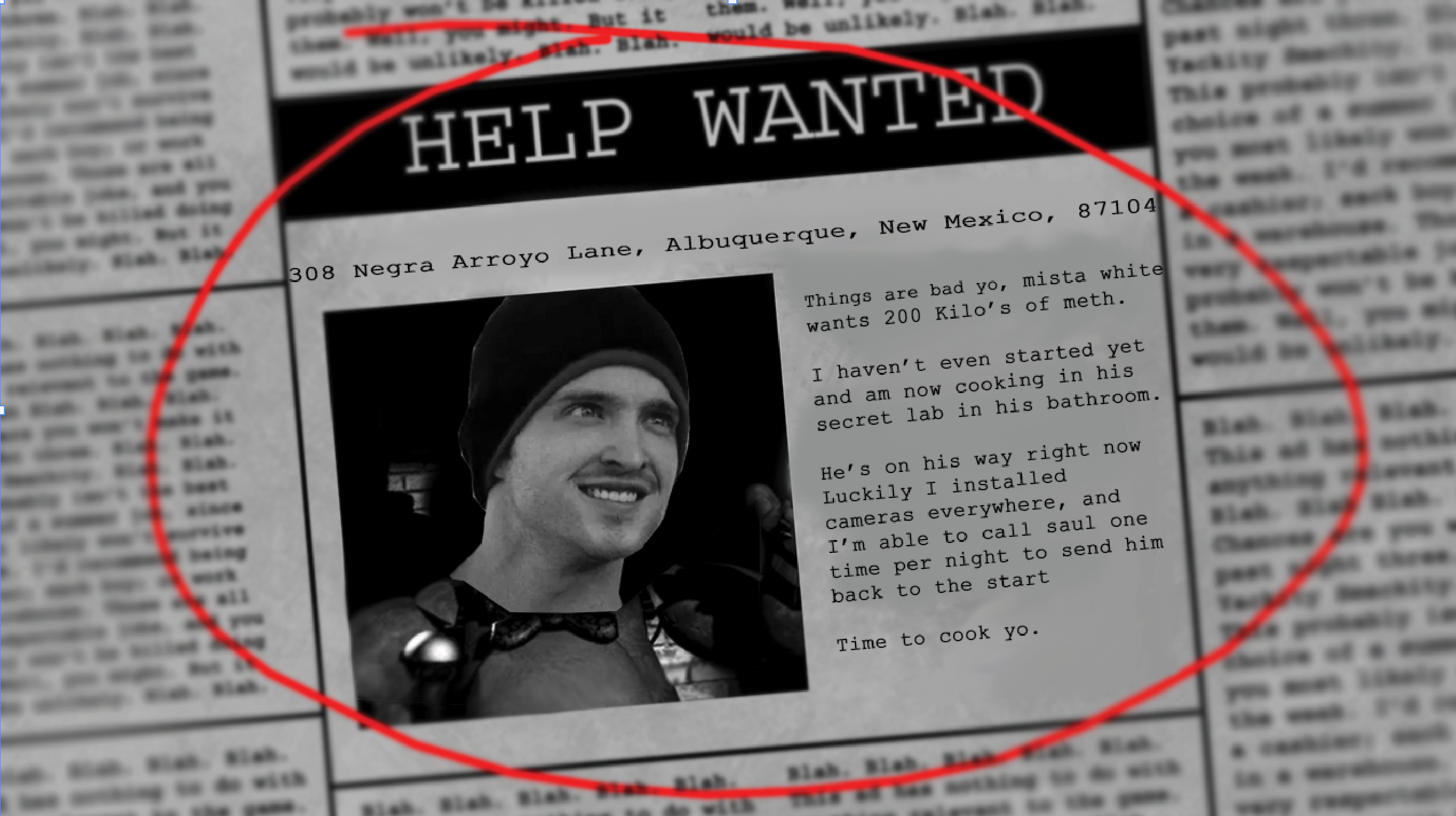 Je speelt als Jesse Pinkman die vastzit in de badkamer van het huis van Walter White, waar Walter White 's nachts probeert binnen te komen. Je moet genoeg meth koken om Walter White tevreden te maken wanneer hij binnen komt, anders zal hij boos worden en je vermoorden. Je kan op de camera's kijken waar Walter op dat moment is en je kan eén keer per nacht Saul Goodman bellen om Walter White terug te sturen naar het begin.