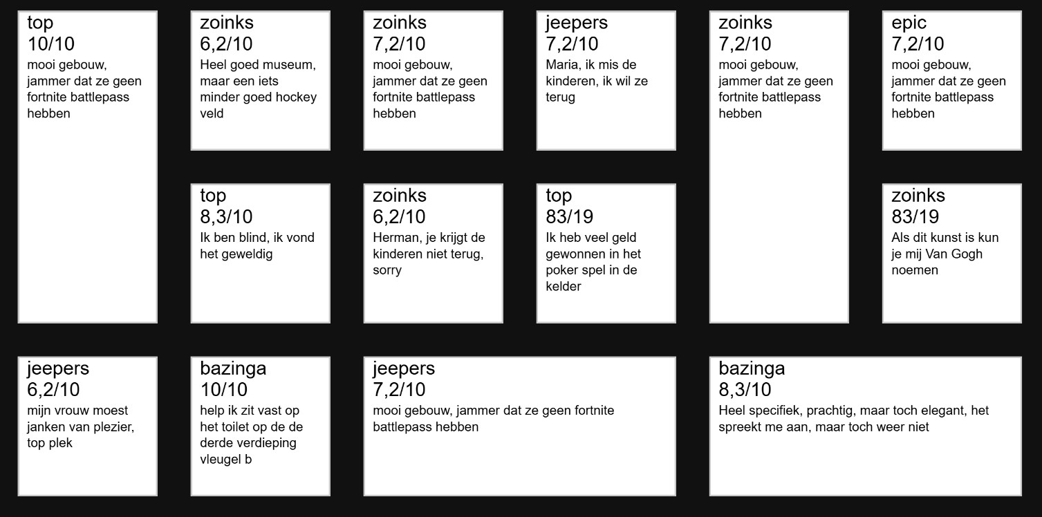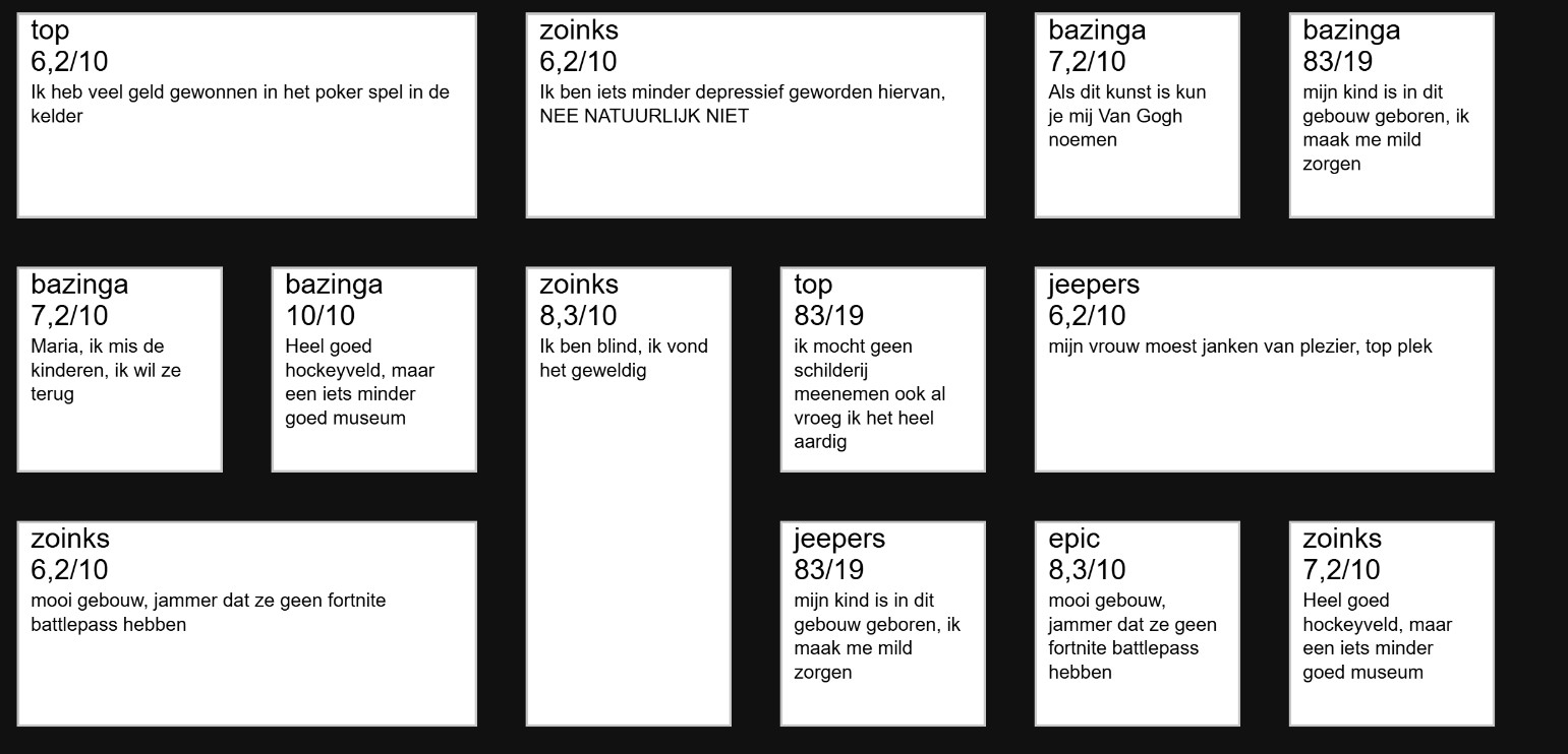 De reviews overlappen nooit met elkaar, ik heb het gemaakt voor het NXT museum in module 2 van het eerste schooljaar op het MediaCollege, het was een twee persoonsopdracht waar jullie een website moesten maken voor het moderne kunst museum NXT in Amsterdam. Het deel van de reviews van de website was volledig door mij gemaakt. De volledige website is hier te vinden.